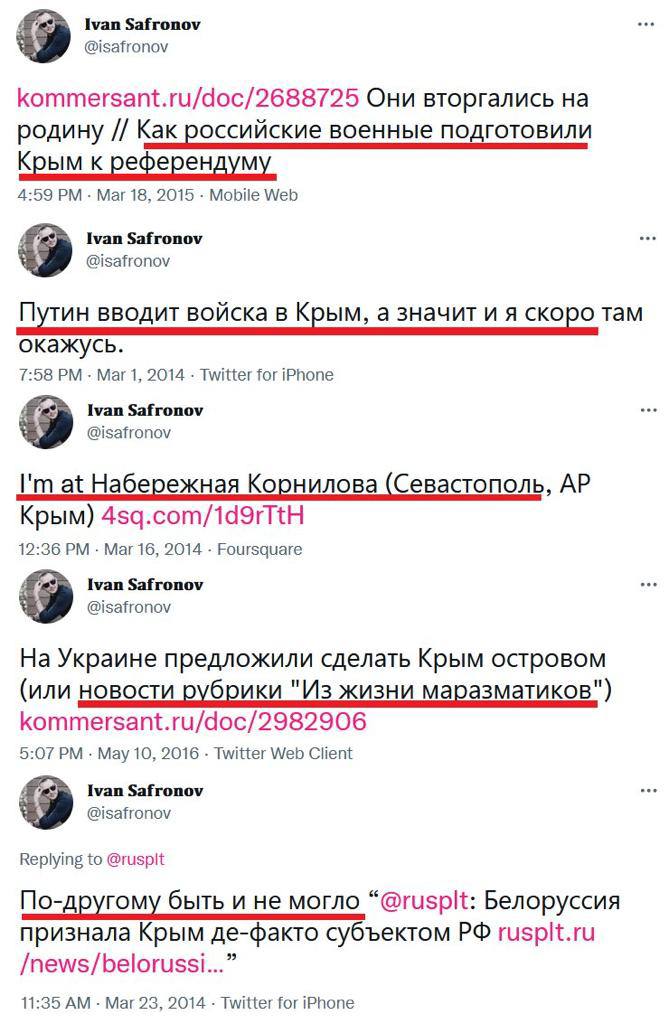 "Полковник ГРУ Сергей Скрипаль, который передавал секретную информацию британской разведке, был приговорен за госизмену к 13 годам тюрьмы. Потом ГРУ пыталось убить его в Англии. Иван Сафронов, со своими обзорами по открытым источникам, по версии ФСБ и суда, почти в два раза опаснее Скрипаля. Он получил 22 года".